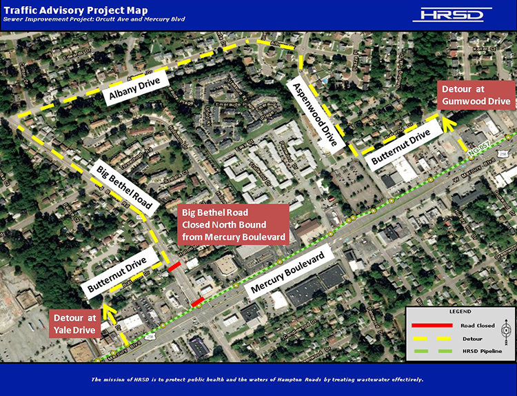 During the rehabilitation work, motorists traveling on Big Bethel Road will follow a signed detour around the affected intersection. For motorists travelling in either direction on Mercury Blvd who wish to access Big Bethel Road, the detour will be Gumwood Drive to Butternut Drive to Aspenwood Drive to Albany Drive and to Big Bethel Road. For motorists travelling westbound on Mercury Blvd, the signed detour will be Yale Drive to Butternut Drive to Big Bethel Road as indicated in the map located here.